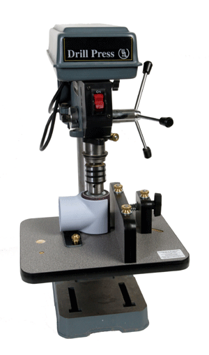 The Luthier's Friend consists of a a 10" x 12" laminated base (254mm x305mm) with a micro-adjustable fence and 2x3" heavy duty sanding drum with a lower guide bearing. Mount it on your drill press, make a few quick adjustments, and you are ready to go. You can thickness and pattern sandwood up to 2-7/8 " tall (73mm). Lock the fence in position and make a heavy cut to sand a your material to a rough dimension. Remove a few thousandths of an inch by turning the spring loaded micro-adjust knob, locking the fence, and running the part through again. When the Robo-Sander is locked in the full down position, the guide wheel becomes a lower bearing insuring the stability needed for accurate thickness sanding. This also eleminates deflection and wear and tear on the drill press. Dust free operation is achieved with even the smallest shop vac attached to the dust shroud surrounding the drum. In the up position, use the Robo-Sander flush trim sander to duplicate parts using a template or even an old part as a pattern. Lower the flush trim bearing into the table and you have a very stable sanding drum with which you can quickly freehand complex shapes. When you are not using the Luthier's Friend, You can hang it on the wall and use the drill press as you normally would. |