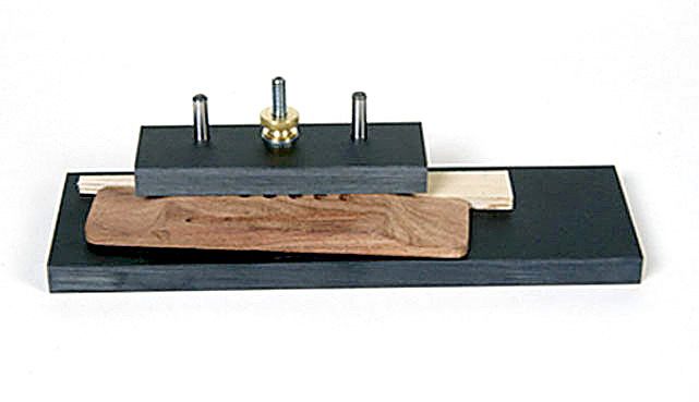 | The Bridge Compensator™ will hold a guitar bridge precisely and safely while you mill the compensation slot. Use a shim cut to the proper angle to index the bridge. The Luthier's Friend™ micro-adjustable fence will allow you to set up perfectly and the long base allows for a safe and easy feed. Chuck up an end mill in your drill press and you are set to go.The Bridge Compensator™ gives you repeatable accuracy for small production runs. Use it without the shim to drill the bridge pin holes. The Bridge Compensator™ turns your Luthier's Friend™ into a bridge making machine.