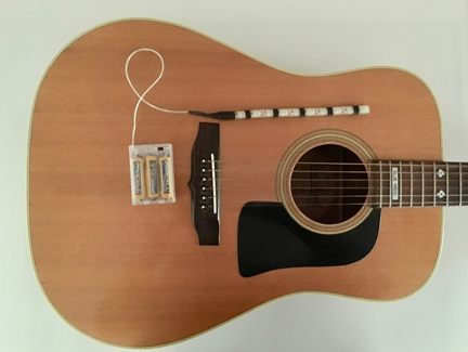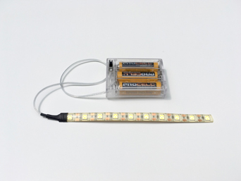 The Guitar model has a total of 20 LEDs to produce more lighting for the larger instrument . LEDs are on both sides of the strip and Velcro band is included for mounting battery box out of the way on the neck of the instrument . |